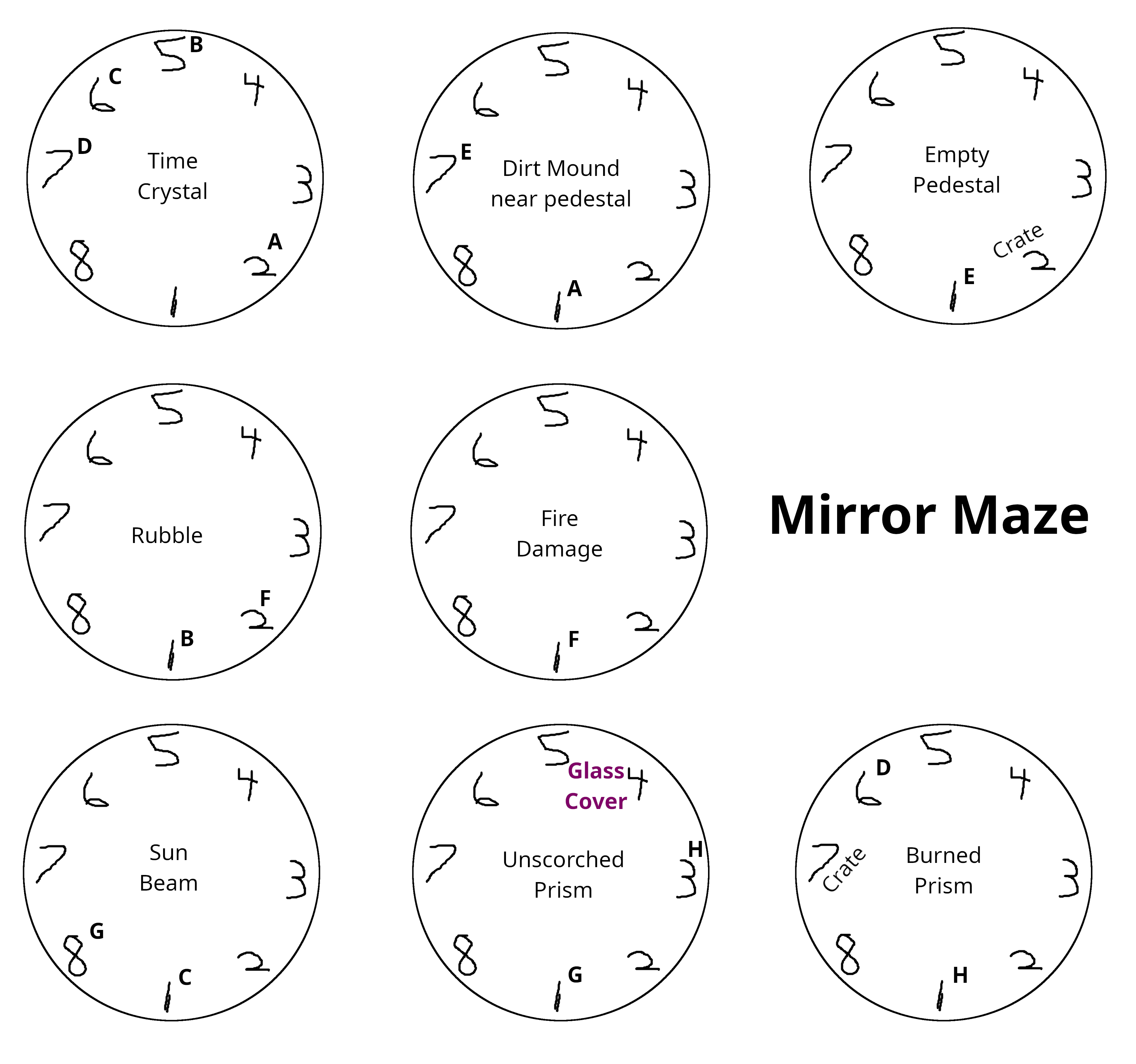 Attached to the right is a crude map I made. The mirrors along the wall are numbered from 1-8. To make things as simple as possible, the location marked as "1" in each room is where you entered from. Probably not how the devs mapped it out, but it made it easier for me to keep track of where I was so hopefully it will for you as well. The letters denote which mirrors are connected. So, to start things off, use the Time Orb on the time crystal and activate the mirrors. As you can see, you can travel to the room labeled Rubble and into the Fire Damage room to see the results of the fire, but this is completely optional once you know that a fire happens. Here's how to save the prism: