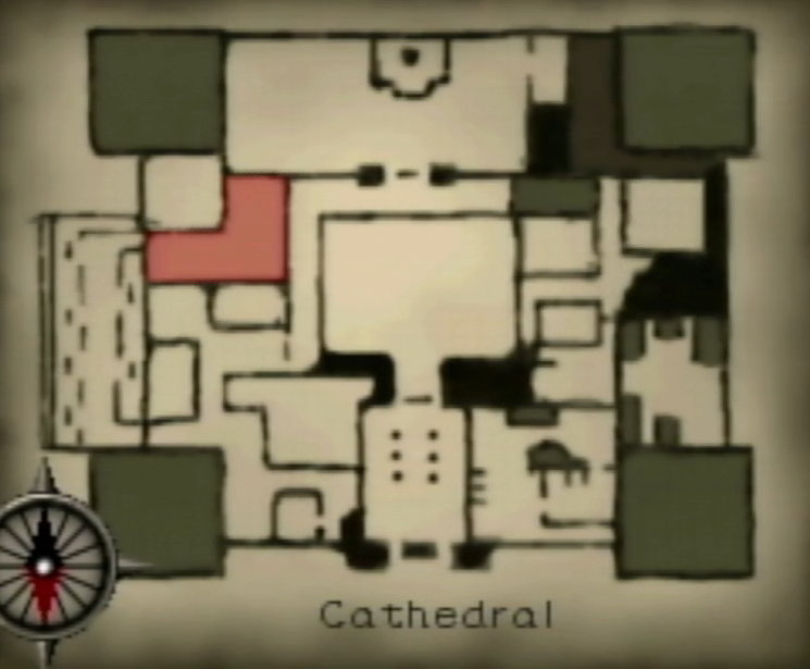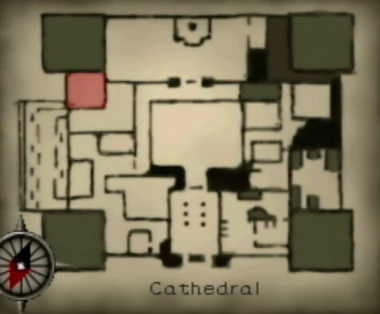 The door on the right is locked, so enter the door of the cathedral on your left.