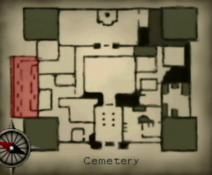 You find yourself in a shallow ditch at the bottom of the rope. Well...shallow for people who aren't pixie-sized. Use the Pixie Flute again to return to your normal size. There's nothing we can do with the tombstones right now, so just follow the path all the way to the door. Head through into the churchyard.