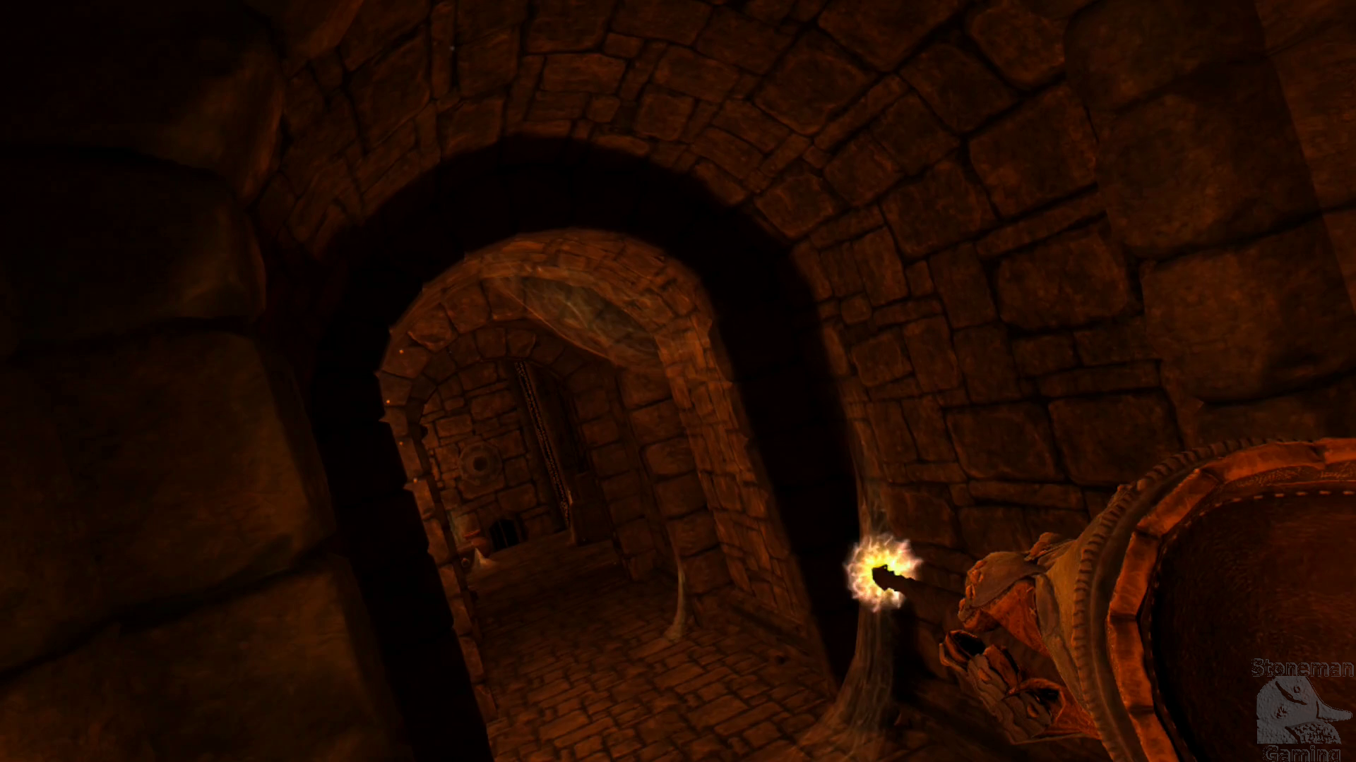 Upon reaching the safe strip of land, two Big Mouths will rise from the depths and attack you. Use your Shield to block their green fire, and zap them with your Wand to dispatch them. After the beasts are defeated, turn your attention to the pillar nearby. There's a small square hole on the lower part. Place one of the Rune Tablets in that slot. This will cause another section of floor to rise up.