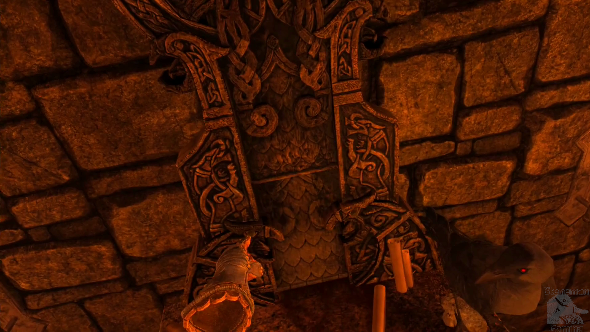 Once the enemy has been dispatched, shoot both Runic Plates again to lower both blue barriers. Make a dash past the second one to reach a Save Point. There's a perch for Odin on one side, and a large hanging tapestry on the other. Burn the tapestry across from Odin to reveal a hidden room. Move down the newly revealed stairs. At the bottom, you'll be attacked by two Spiders. Back up the stairs as you fire on them to stay safe. Once they're gone, head back down into the room.