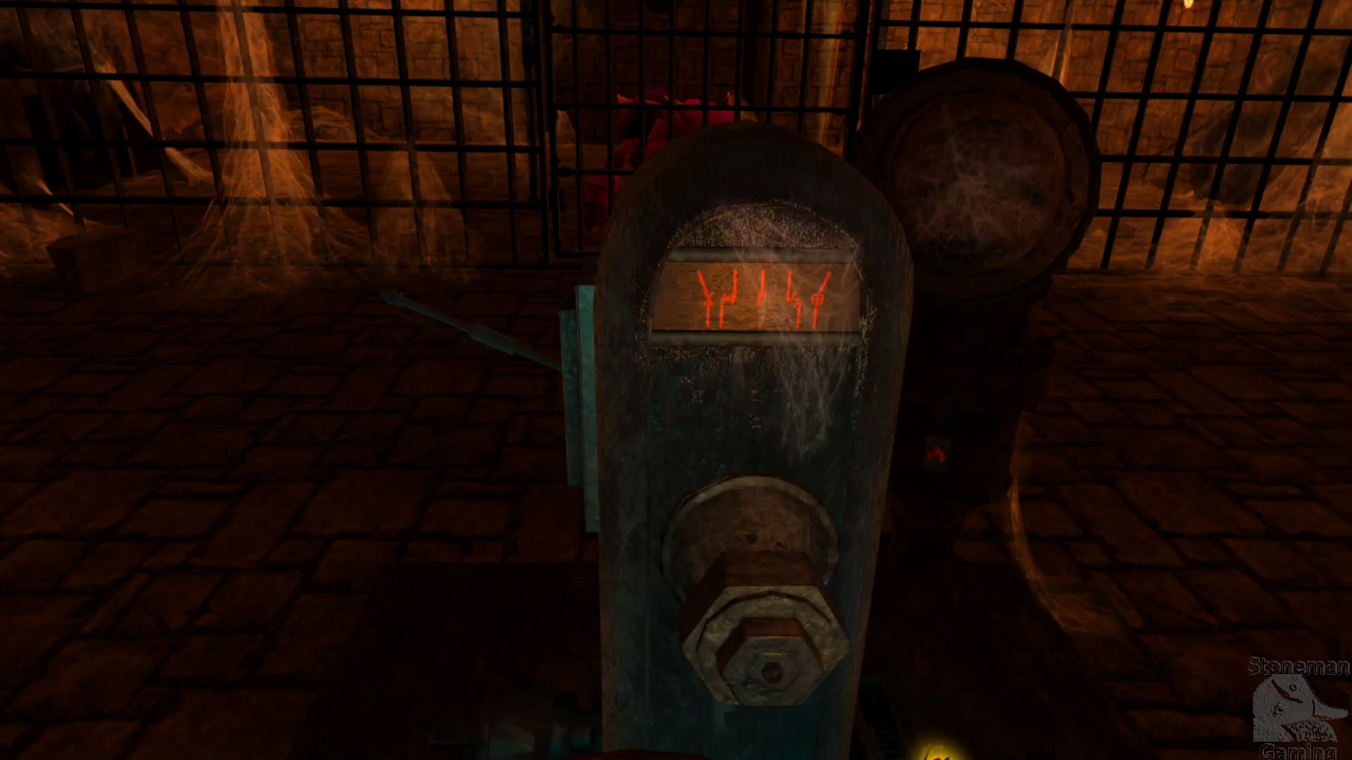 Now for the fun part of the room. There's an item we need inside the giant cage, but it's currently swarming with Large Spiders. Behind the rune device is a large pipe. If you shoot fire into the opening, the fire will travel through the pipe and emerge out of another pipe opening in the cage. The fire will shoot across the room until it hits a wall or a creature. The goal is to shoot all the spiders using this method. But how do you aim at them while they wander?